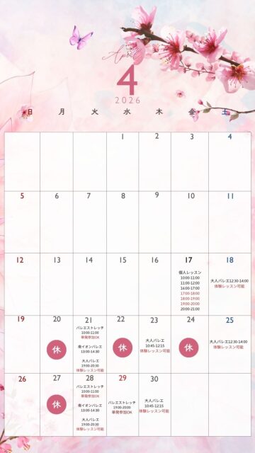 4月のスケジュールは、大人クラス・バレエストレッチクラスのみ受講および体験レッスンが可能です🩰